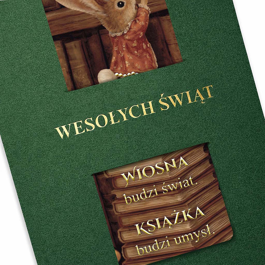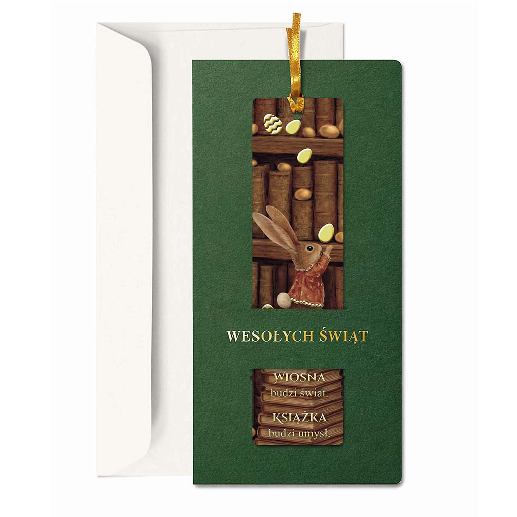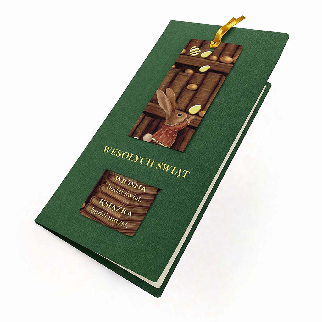 Minimalistyczna, zielona okładka nawiązuje do wiosennej odnowy i stabilności. Centralnym elementem kartki jest wyjmowana zakładka z ilustracją wielkanocnego zająca na tle biblioteki - motyw subtelny, kulturalny i uniwersalny, dobrze wpisujący się w komunikację marek świadomych swojego wizerunku. Złota tasiemka nadaje całości elegancki charakter i podkreśla użytkową funkcję zakładki.