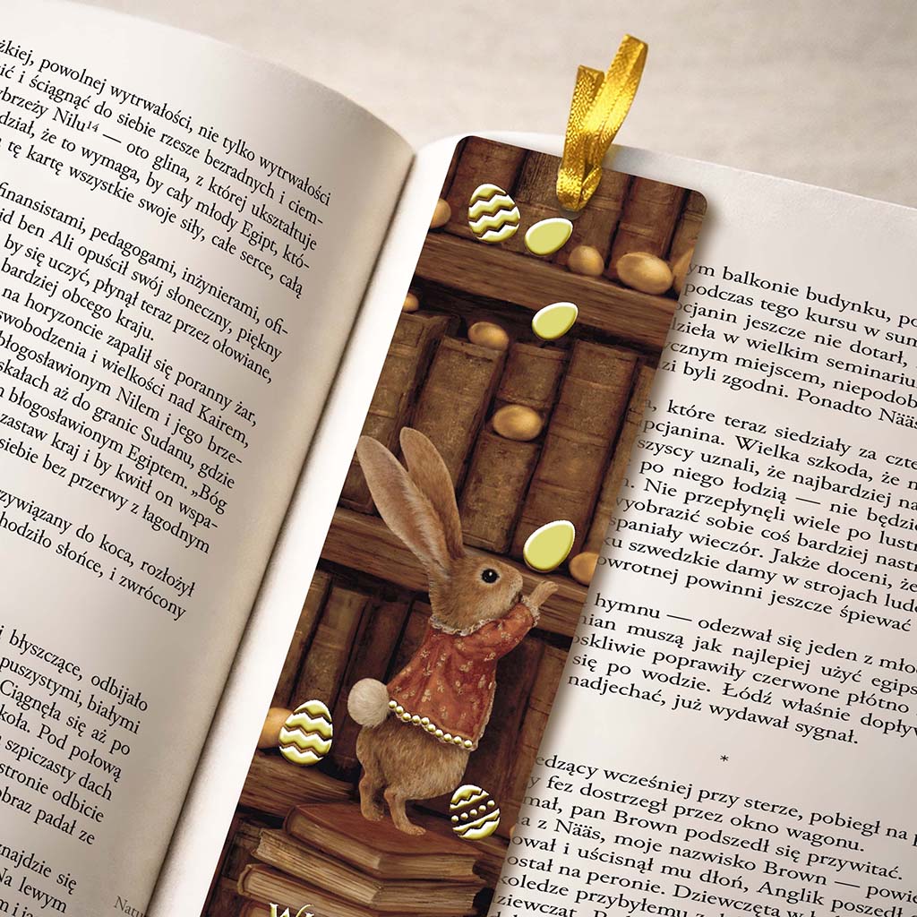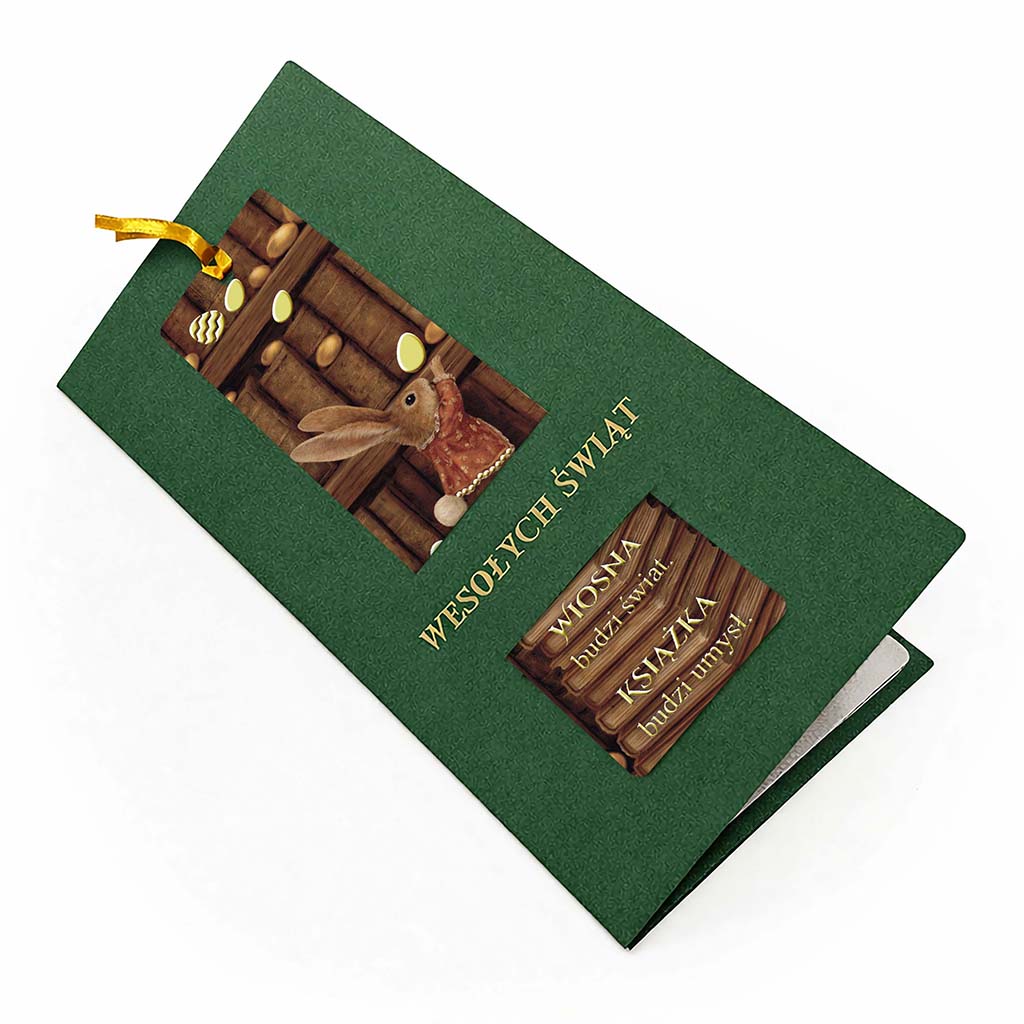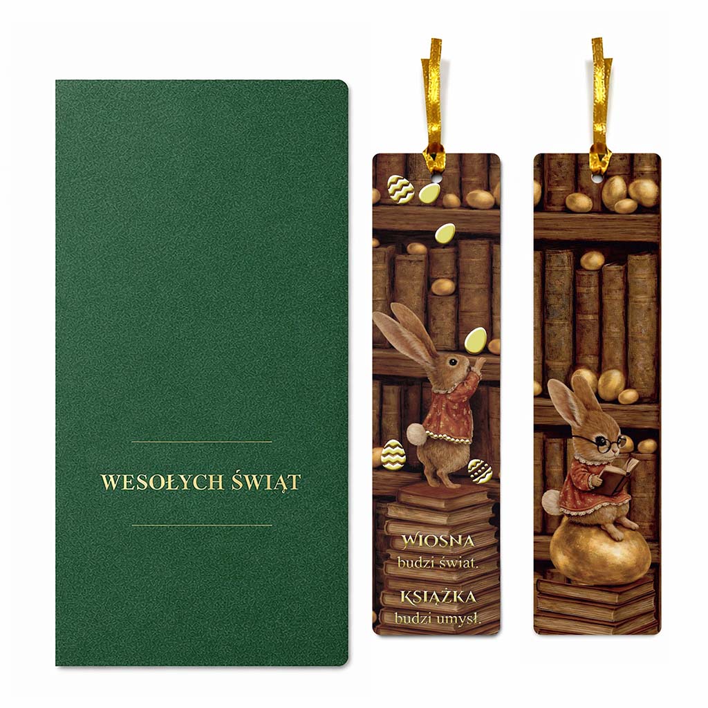 Minimalistyczna, zielona okładka nawiązuje do wiosennej odnowy i stabilności. Centralnym elementem kartki jest wyjmowana zakładka z ilustracją wielkanocnego zająca na tle biblioteki - motyw subtelny, kulturalny i uniwersalny, dobrze wpisujący się w komunikację marek świadomych swojego wizerunku. Złota tasiemka nadaje całości elegancki charakter i podkreśla użytkową funkcję zakładki.