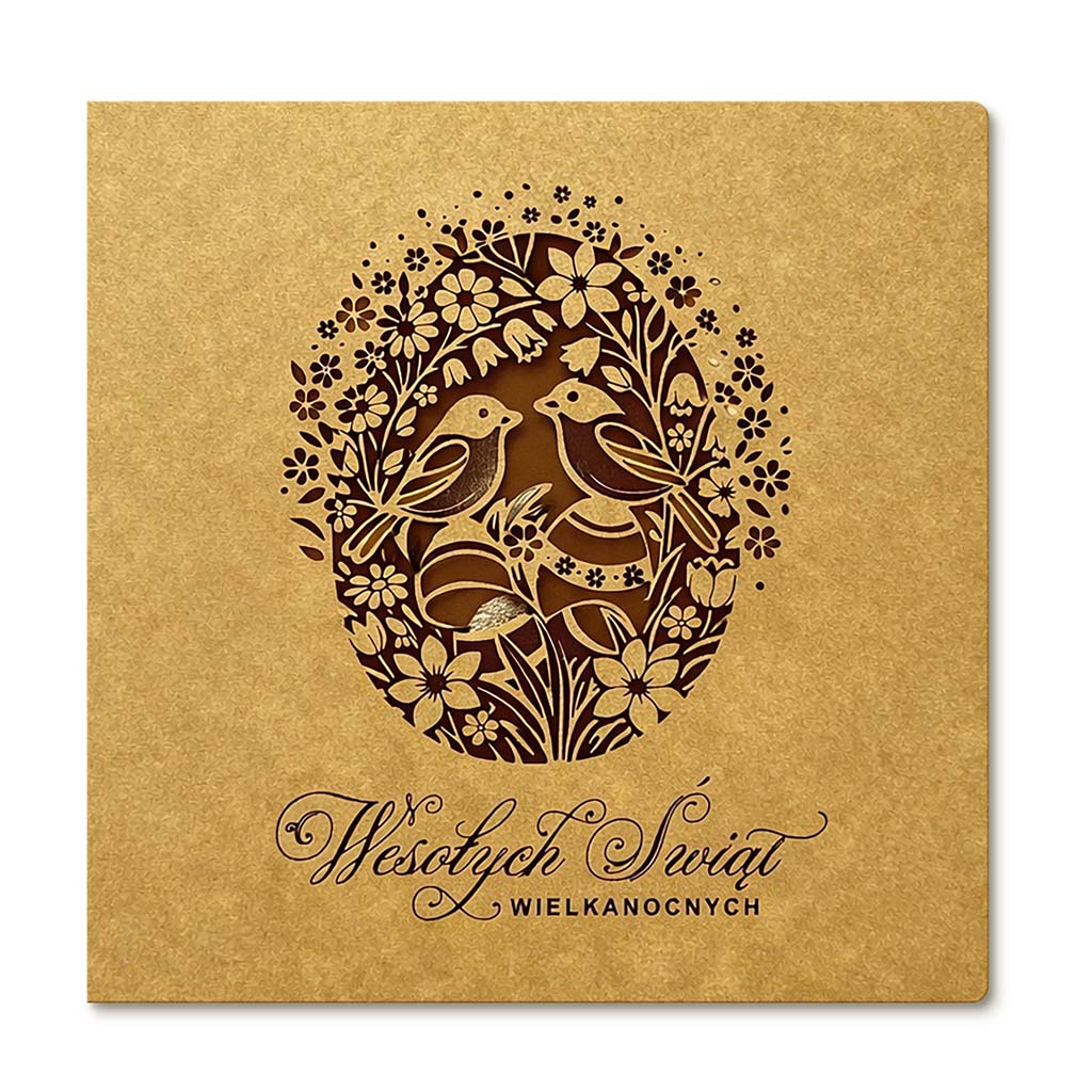 Centralnym motywem jest dekoracyjne jajko wielkanocne wypełnione ilustracyjnym wzorem ptaków i roślin, symbolizującym życie, harmonię i odrodzenie natury. Wzór został wykonany z zastosowaniem hotstampingu w kolorze brązowym, który subtelnie kontrastuje z tłem, podkreślając detale kompozycji i nadając całości elegancki, naturalny charakter.