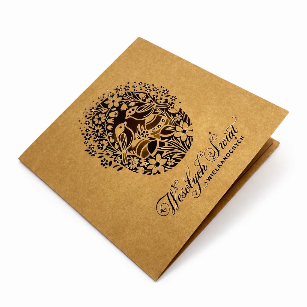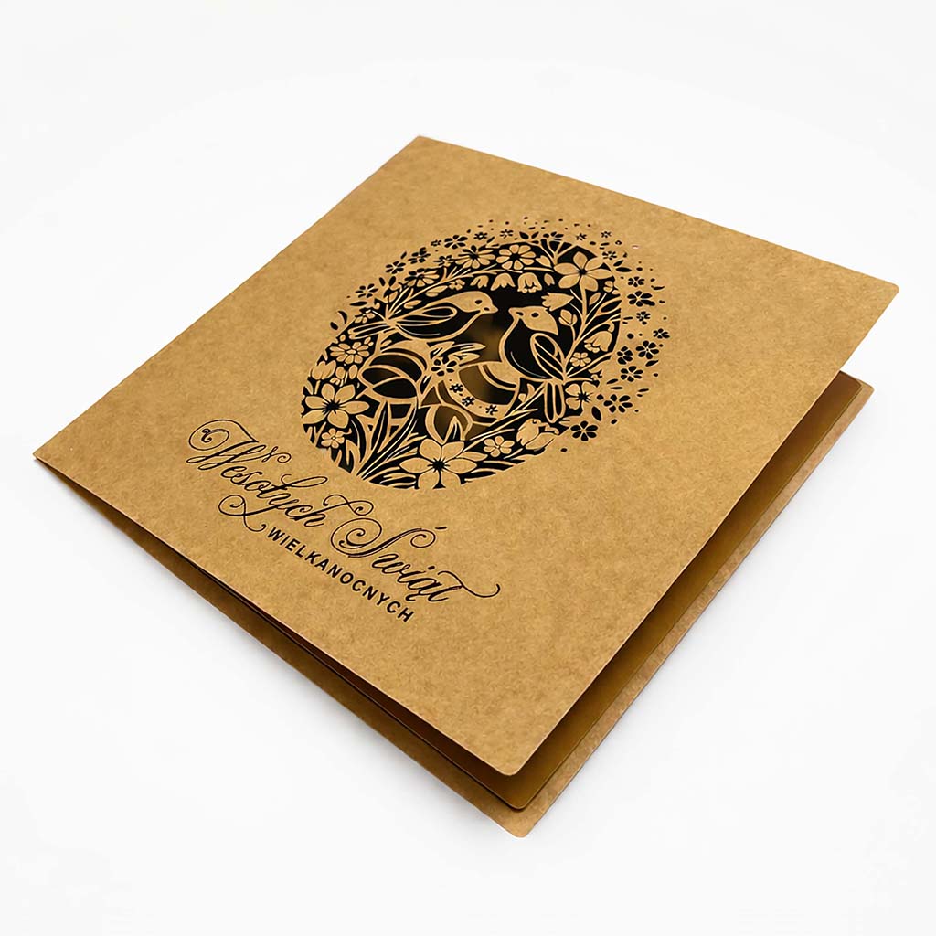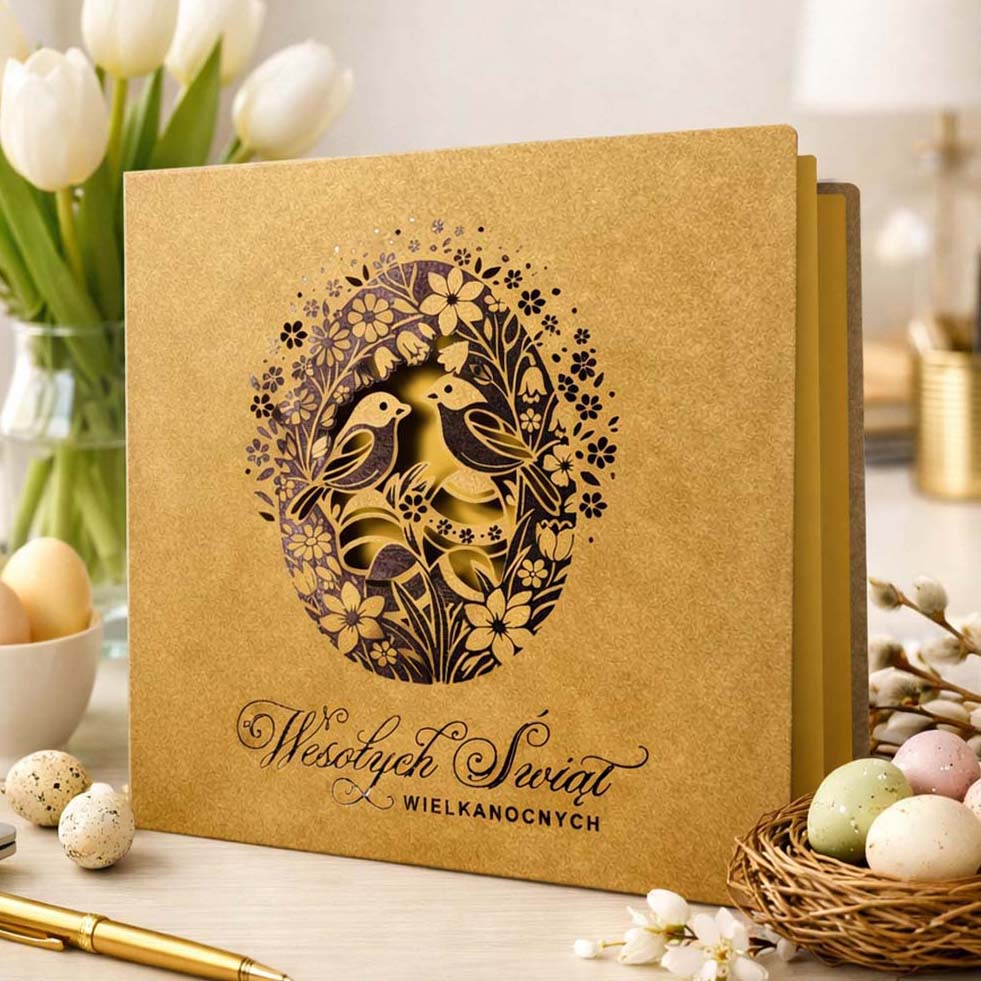 Reprezentacyjna kartka wielkanocna w dużym formacie 160 × 160 mm, zaprojektowana z myślą o firmach i instytucjach, które cenią ekologię, jakość wykonania oraz stonowaną, naturalną estetykę w komunikacji świątecznej. Projekt łączy symbolikę wiosennego odrodzenia z elegancką, uporządkowaną formą odpowiednią dla relacji biznesowych.
