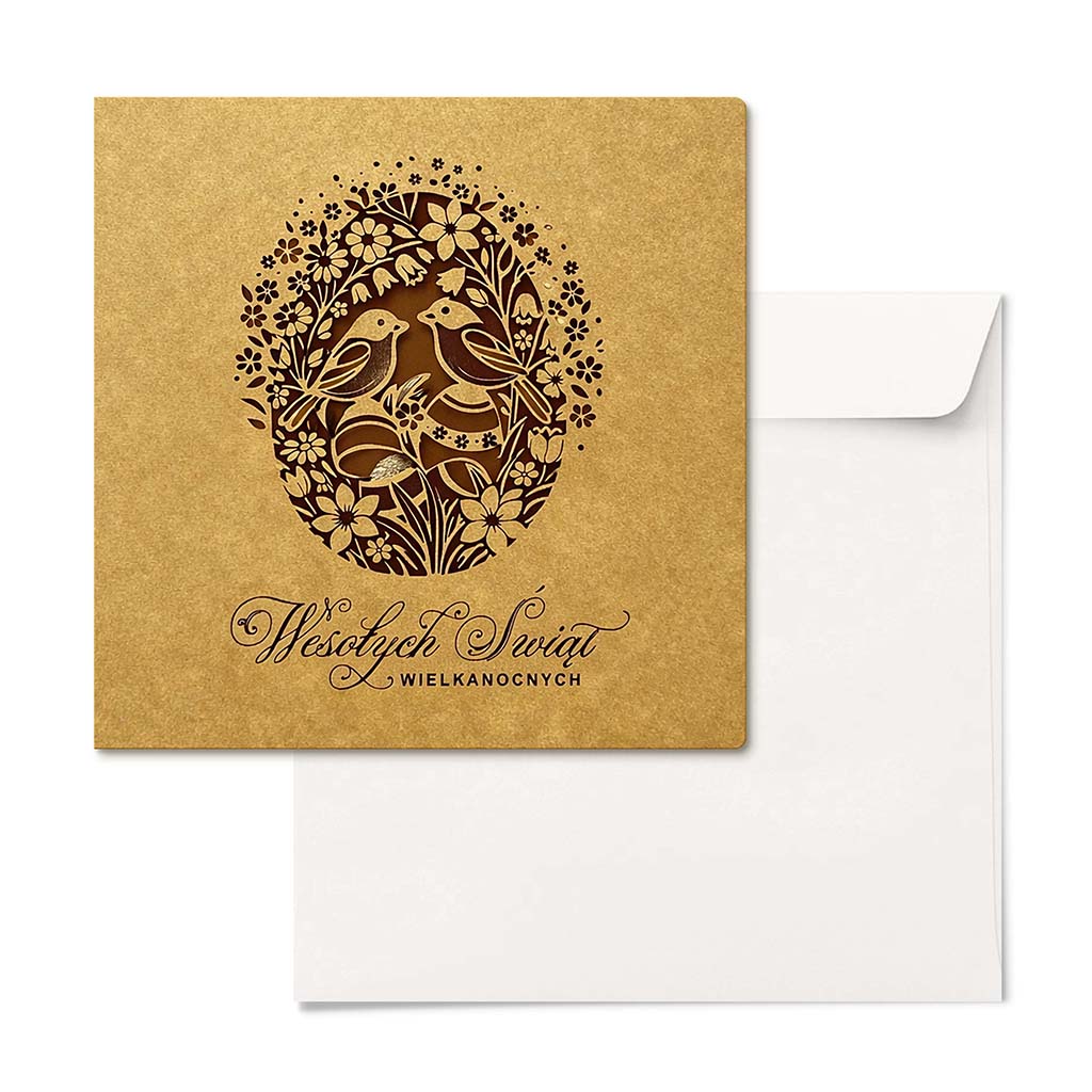 Na froncie umieszczono klasyczny napis "Wesołych Świąt Wielkanocnych", utrzymany w ozdobnej, kaligraficznej stylistyce, spójnej z całością projektu i odpowiedniej dla oficjalnej korespondencji świątecznej.