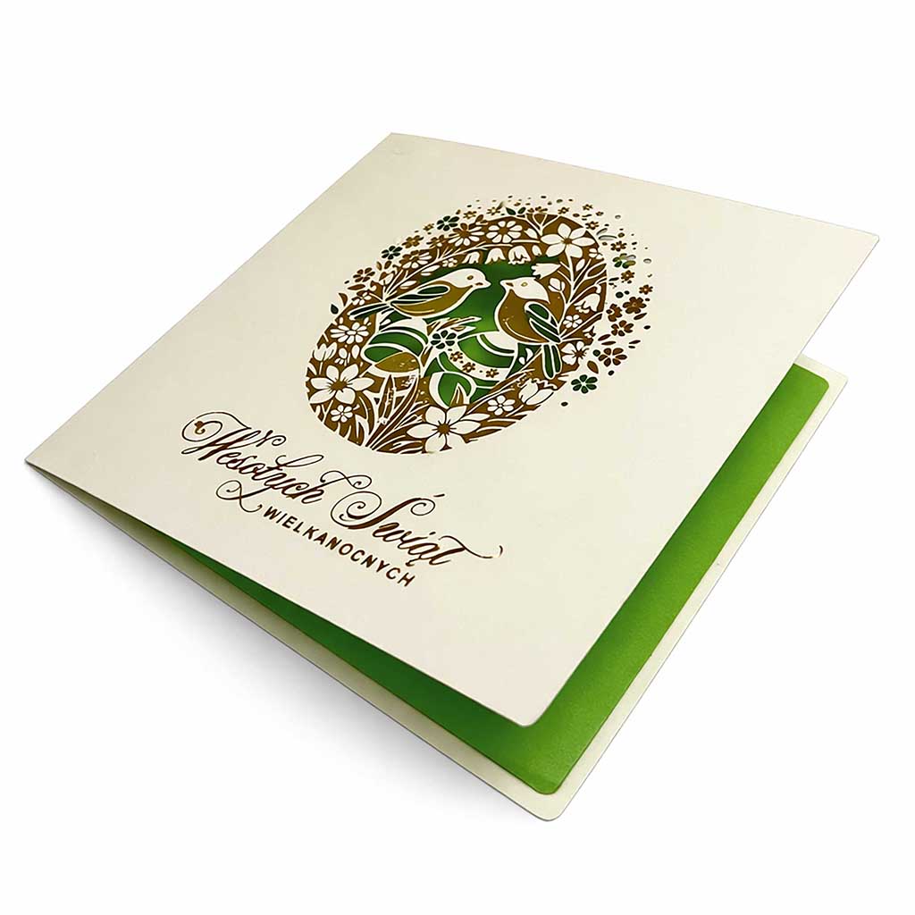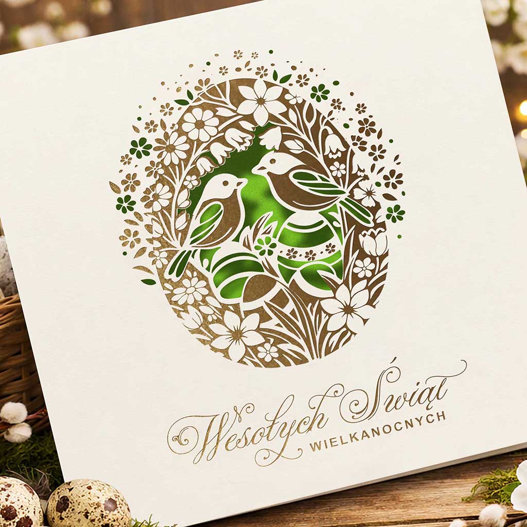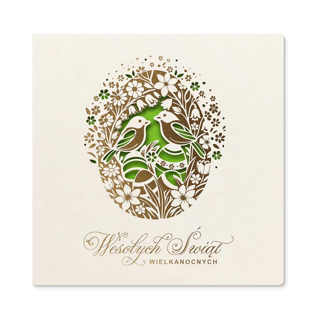 Centralnym elementem kompozycji jest dekoracyjne jajko wielkanocne, wypełnione subtelnym motywem ptaków i roślinności, symbolizującym życie, harmonię i wiosenne odrodzenie. Wzór został wykonany z zastosowaniem precyzyjnego złocenia, które nadaje kartce elegancki, lekko połyskujący akcent i podkreśla jej ekskluzywny charakter.