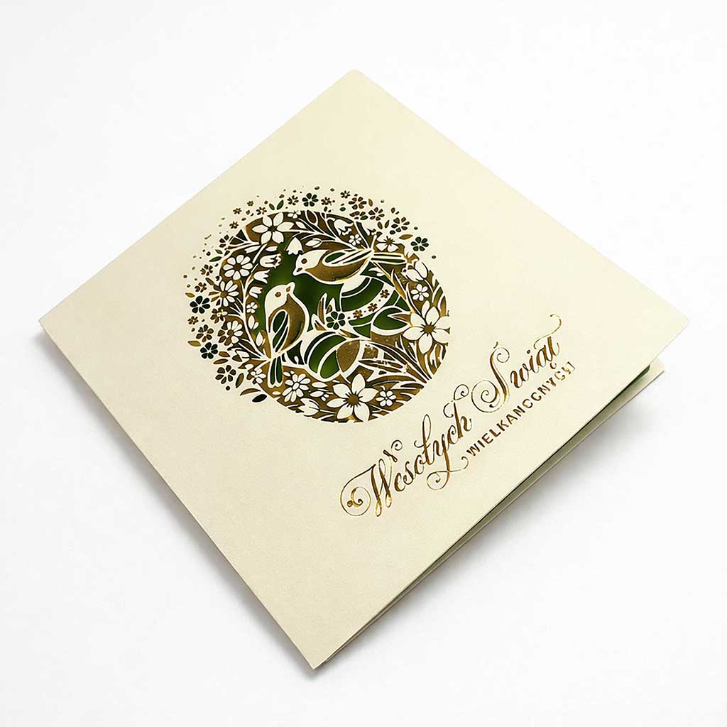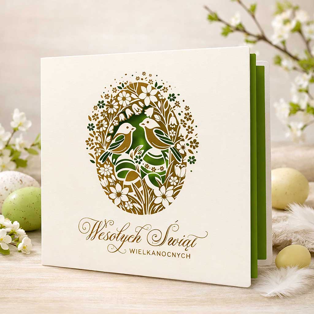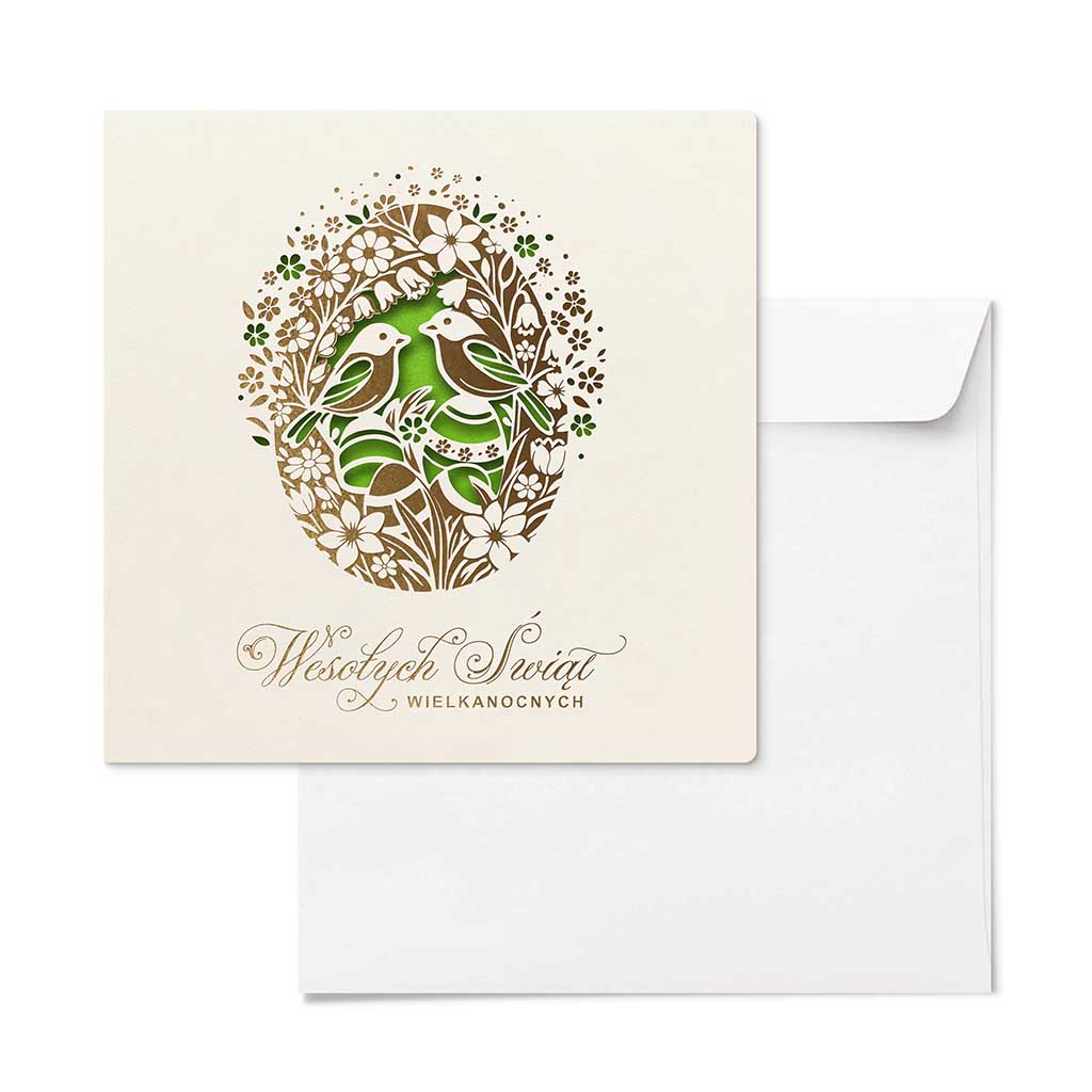 Centralnym elementem kompozycji jest dekoracyjne jajko wielkanocne, wypełnione subtelnym motywem ptaków i roślinności, symbolizującym życie, harmonię i wiosenne odrodzenie. Wzór został wykonany z zastosowaniem precyzyjnego złocenia, które nadaje kartce elegancki, lekko połyskujący akcent i podkreśla jej ekskluzywny charakter.